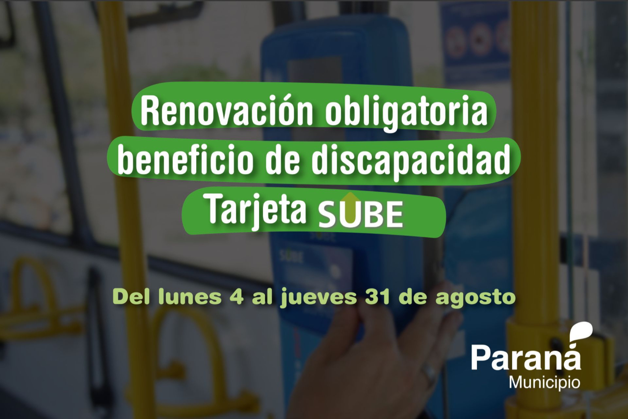 Comienza el proceso de renovación del beneficio por discapacidad de la Tarjeta SUBE. A partir del lunes 4 de agosto, los trámites podrán realizarse de lunes a viernes, de 8 a 13, en la Unidad de Gestión ubicada en avenida Almafuerte 233.