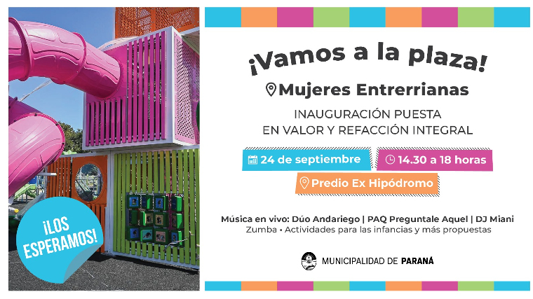 La renovada plaza Mujeres Entrerrianas quedará habilitada este domingo con propuestas para grandes y chicos. Desde las 14.30 hs habrá espectáculos musicales de Dúo Andariego, DJ César Miani y Preguntale Aquel. También habrá deporte y actividades de guía, lúdicas y de entretenimiento en zona de juegos infantiles a cargo de Neurocea, clases de zumba, vacunación (COVID, antigripal adultos, antitetánica), promoción de salud y de los programas Separá y Bicivía. El evento dará cierre también a la agenda de actividades deportivas impulsada por los Complejos Terrazas Padel Club, Gimnasio Fit Park y La Masía la semana previa.