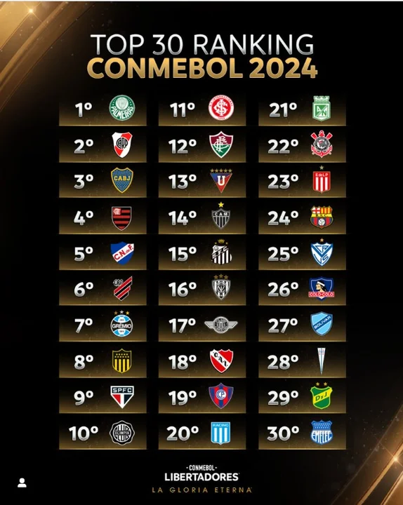 La Conmebol anunció el ranking de clubes para las competiciones del 2024 en el que ubicó a River y a Boca en el segundo y tercer puesto, respectivamente, y a Palmeiras en el primer lugar, siendo uno de los 20 equipos brasileños que ocupan las primeras 30 posiciones.