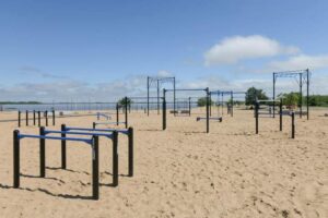 Incluye un área dedicada a la práctica de calistenia, vóley, básquet, fútbol y una estación deportiva completa, para lo cual se refuncionaliza la piscina existente y su entorno inmediato. A su vez se crean conexiones, entre estas actividades, mediante pasarelas materializadas con decks de madera. En torno a dichos espacios se crean áreas de permanencia equipados con bancos, cestos de basura e iluminación LED.