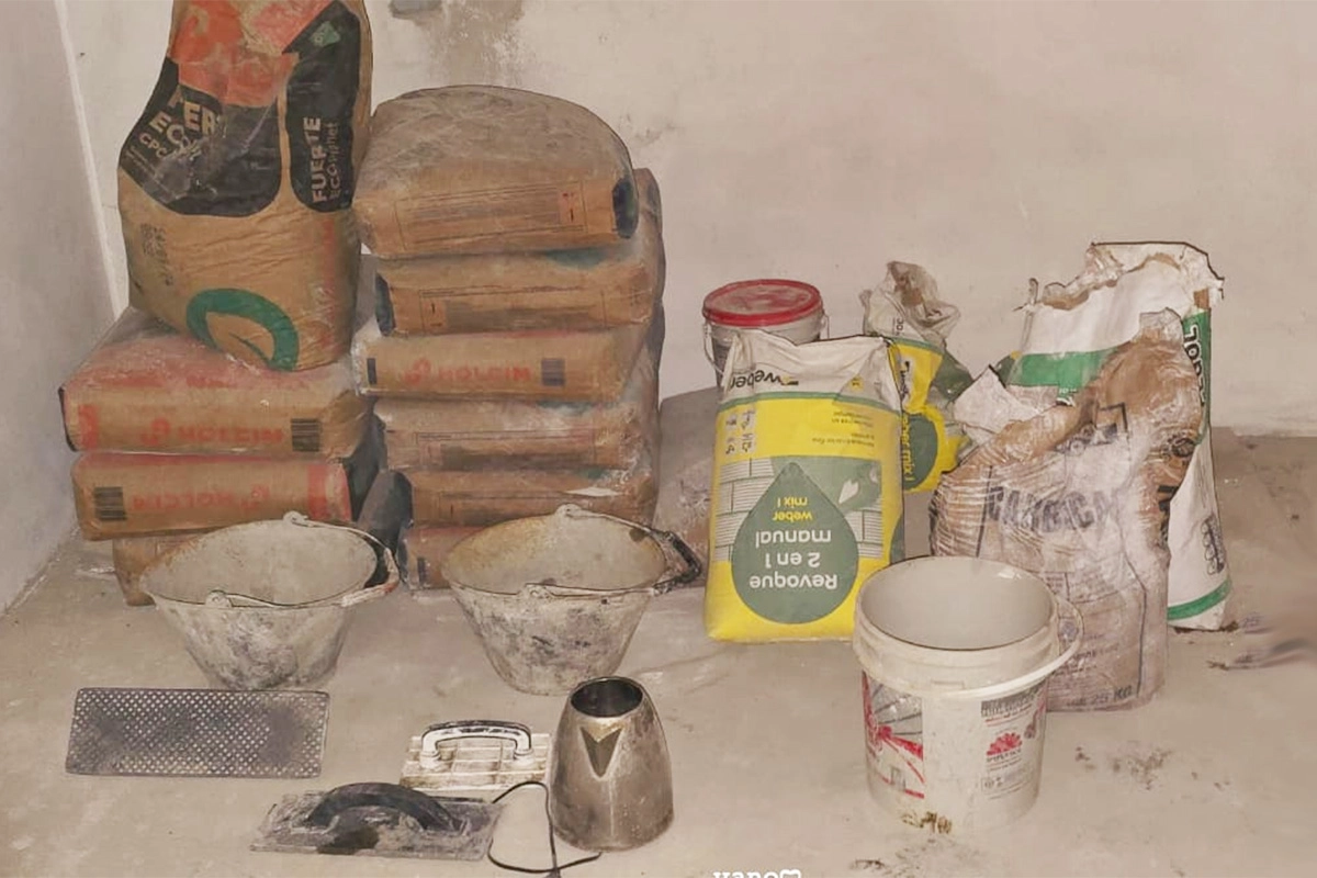 Entre los elementos secuestrados había 10 bolsas de cemento marca Holcim de 40 kg; dos baldes de albañil; cuatro fratachos; una pava eléctrica; dos bolsas de cal de 40 kg; un tarro de hidrófugo marca Impersol; tres bolsas de revoque interior fino y una bolsa de 30 kg de revoque fino a la cal.