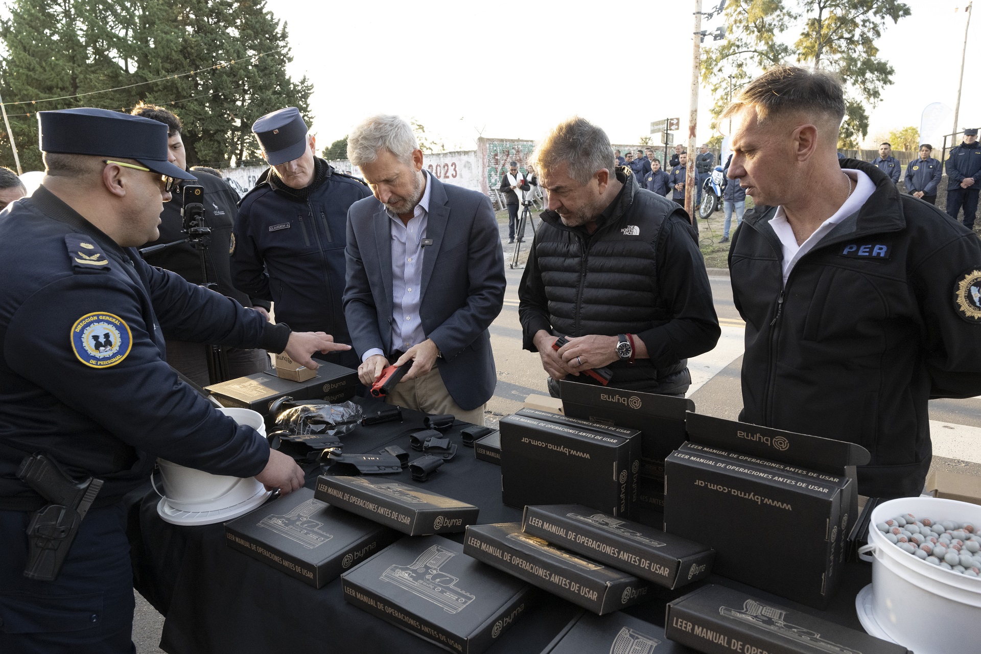 La ocasión fue propicia para presentar cinco móviles cero kilómetro a la Departamental Paraná de la Policía (cuatro patrulleros especialmente equipados para tareas de prevención y patrullaje y una camioneta destinada a labores de apoyo logístico). Asimismo, se entregaron 30 armas de letalidad reducida Byrna SD adquiridas por el Gobierno provincial.