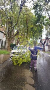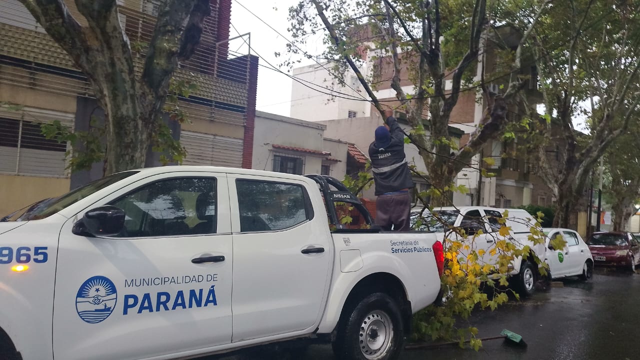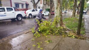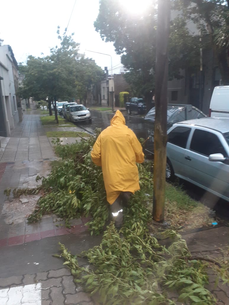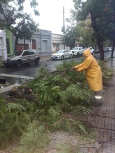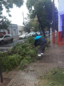 Equipos municipales de Protección Civil trabajan en distintos sectores para brindar asistencia a las personas afectadas por las malas condiciones climáticas. En la ciudad se registró caída de árboles y luminarias.