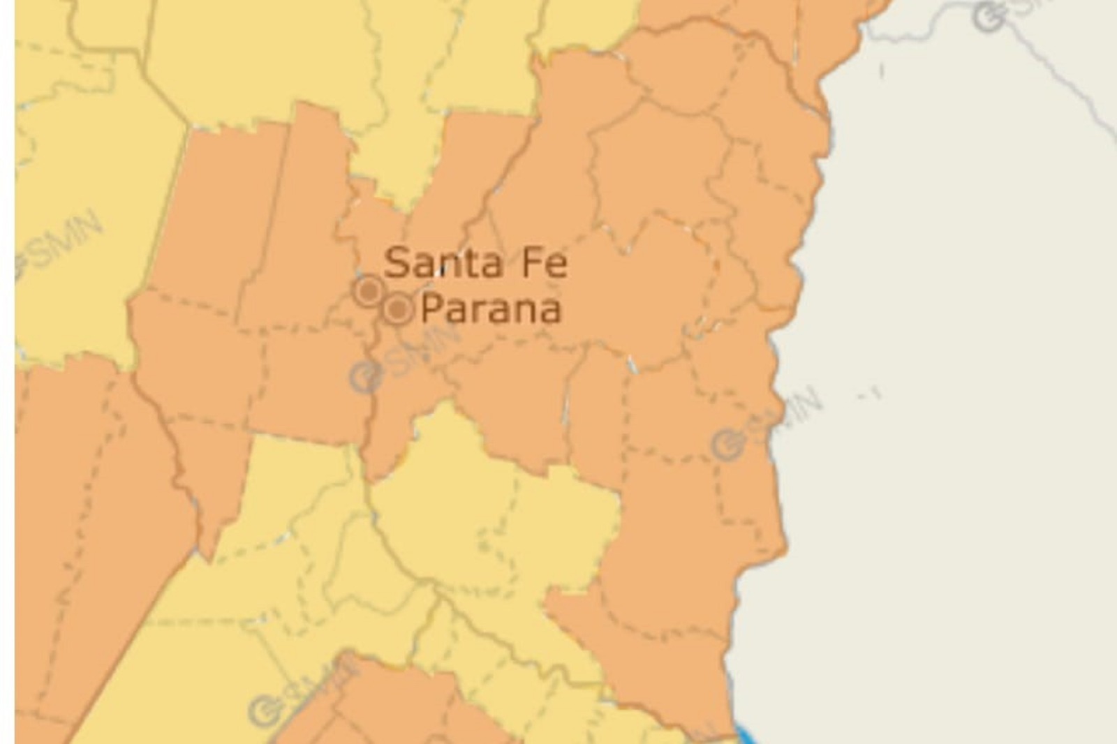 El alerta naranja alcanza a los departamentos: Diamante, La Paz, Nogoyá, Paraná, Villaguay, Concordia, Federación, Federal, Feliciano, San Salvador, Colón, Gualeguaychú, Islas del Ibicuy, Tala, Uruguay.