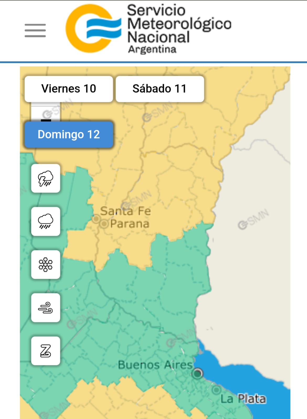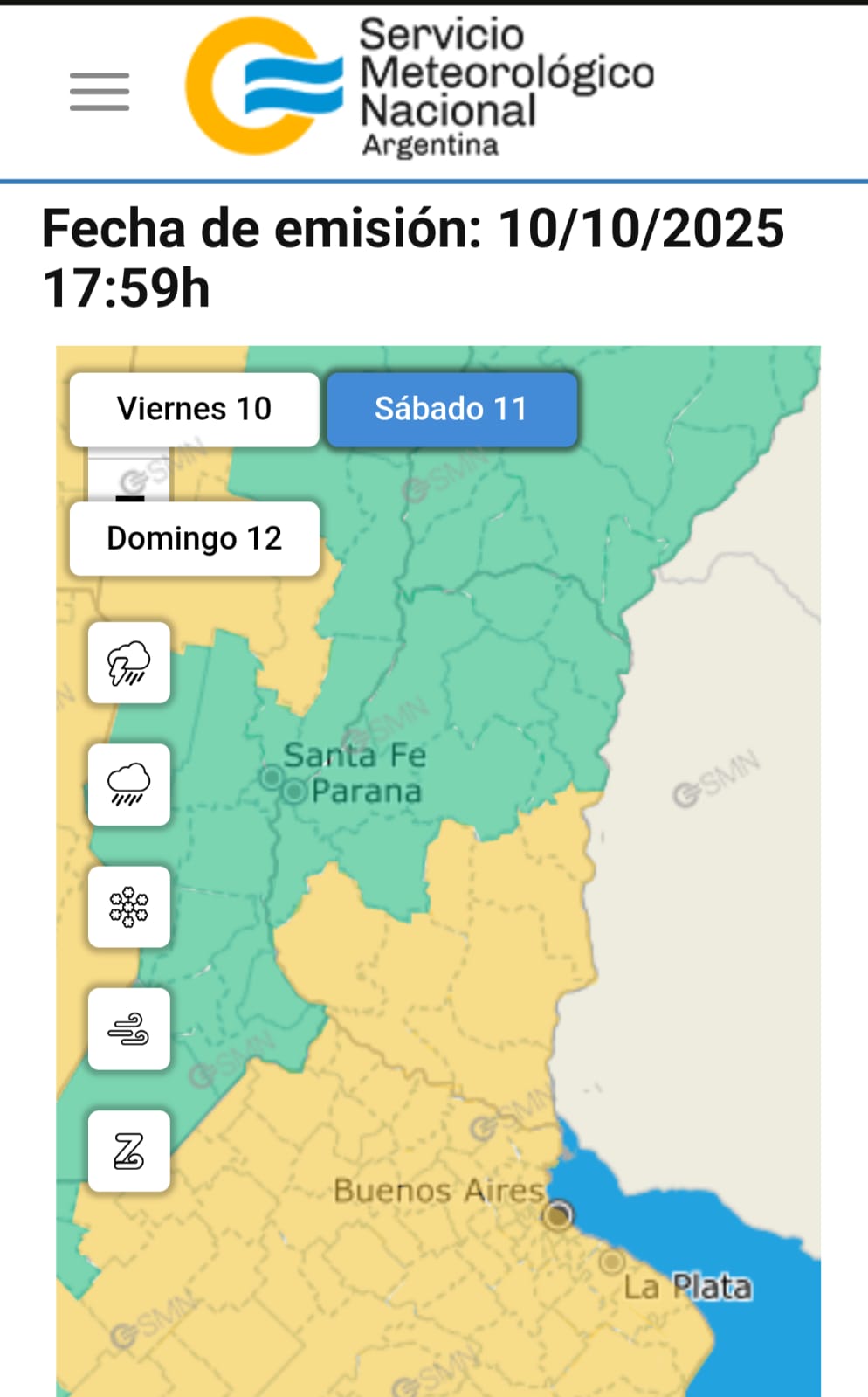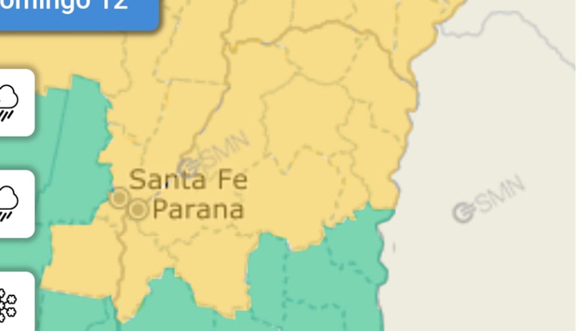 En tanto los departamentos Federal, Federación, Feliciano, La Paz, San Salvador, Concordia, Villaguay, Nogoyá, Diamante y Paraná, son alcanzados por el alerta amarillo el domingo por la madrugada, el área será afectada por tormentas fuertes. Se espera que las mismas estén acompañadas de abundante caída de agua en cortos períodos, frecuente actividad eléctrica, granizo ocasional y ráfagas que podrían superar los 60 kilómetros por hora