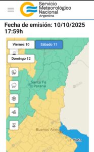 Los departamentos Colón, Uruguay, Tala, Victoria, Gualeguay, Gualeguaychú e Islas del Ibicuy serán afectados por alerta amarilla el sábado por la noche, el área será afectada por tormentas de variada intensidad, algunas localmente fuertes. Se espera que las mismas estén acompañadas por abundante caída de agua en cortos períodos, frecuente actividad eléctrica, ocasional caída de granizo y ráfagas de viento que podrían superar los 60 kilómetros por hora.