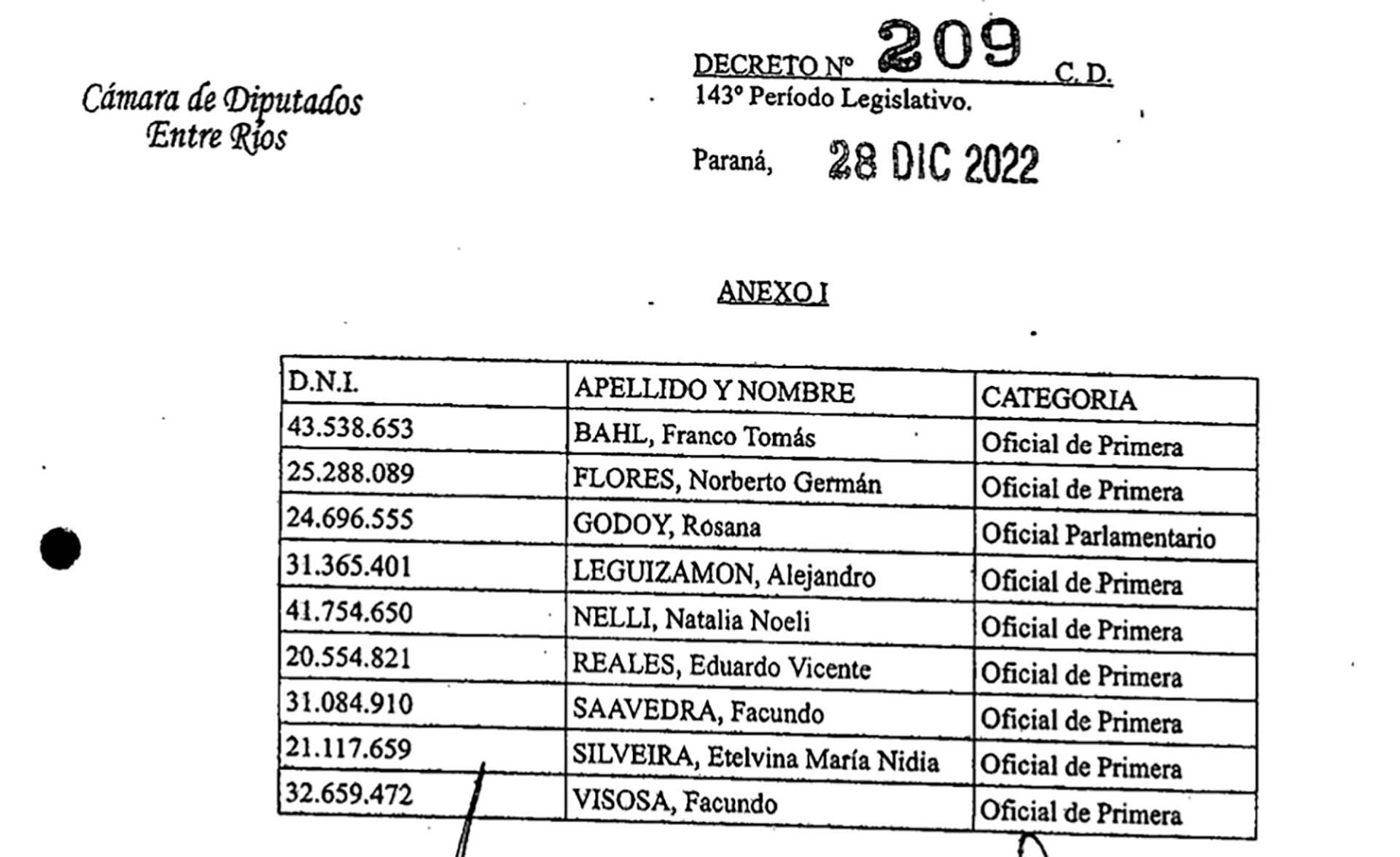 En el listado también aparece Augusto Casaretto (22), hijo del diputado Marcelo Casaretto, que se hizo conocido a nivel nacional por mirar un partido de básquet en plena sesión. El joven de apenas 22 años fue designado en la planta permanente del Instituto del Seguro de la provincia de Entre Ríos.