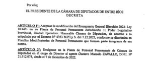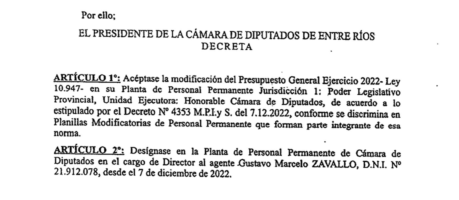 Otro de los beneficiados fue el diputado provincial por el peronismo Gustavo Zavallo: antes de terminar su mandato fue nombrado en planta permanente pero en la Cámara de Diputados de Entre Ríos.