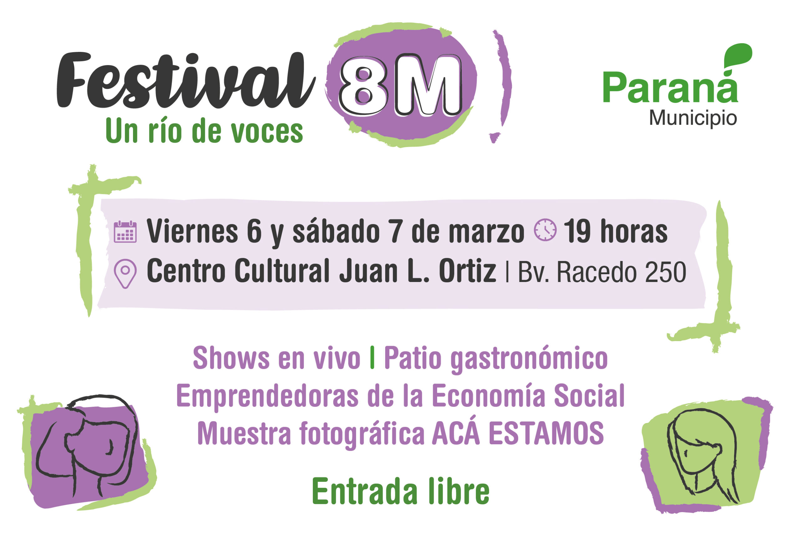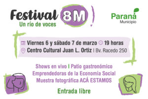 El viernes 6 y sábado 7 de marzo el Centro Cultural Juan L. Ortiz (Bv. Racedo 250), será la sede del Festival 8M “Un río de voces”, con entrada libre para todo público. La propuesta contará con patio gastronómico, emprendedoras de la Economía Social, la muestra fotográfica Acá Estamos y un conversatorio sobre cuidados y redes sociales.
