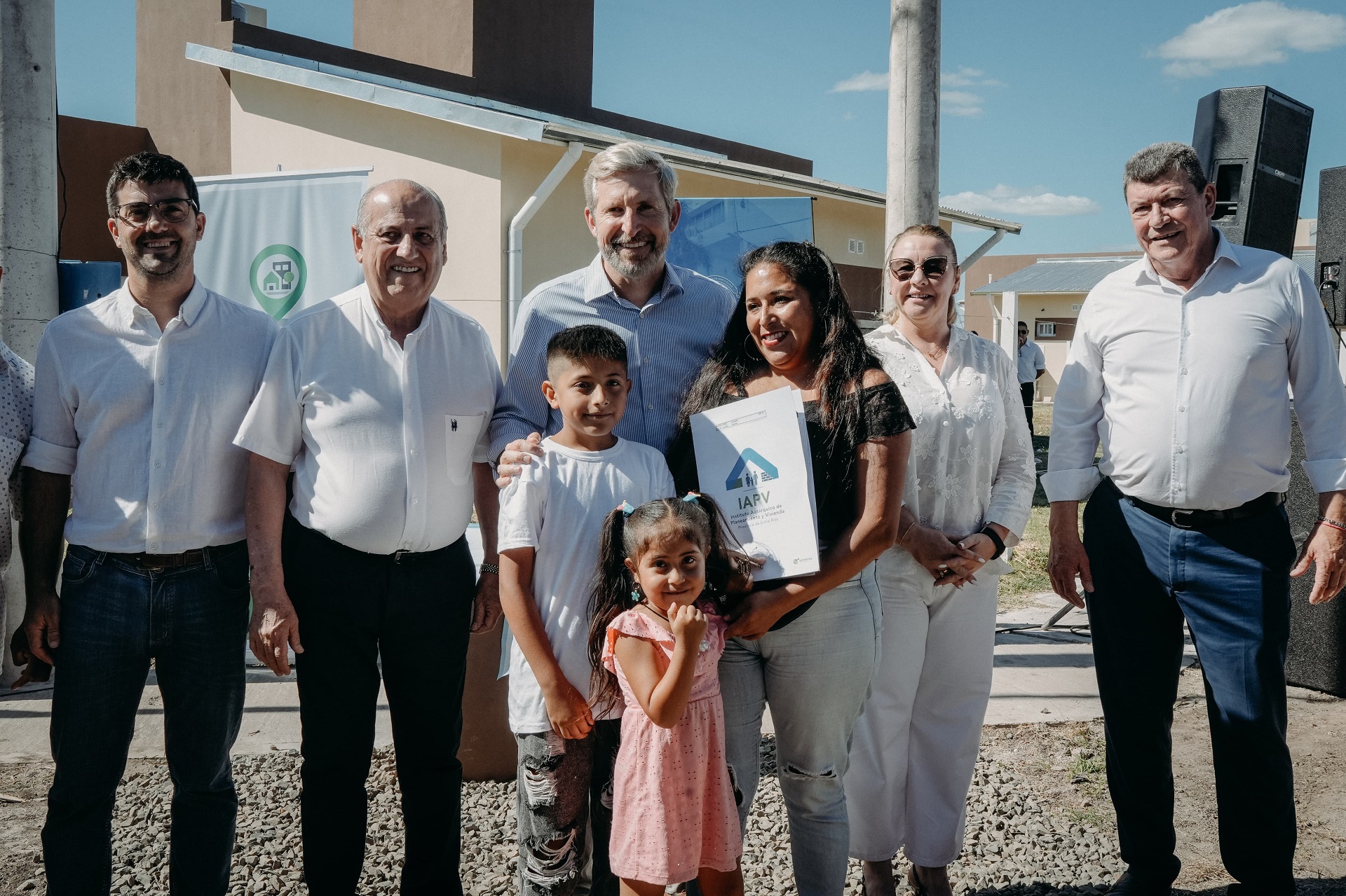 El gobernador anunció el programa del Instituto Autárquico de la Vivienda (IAPV), «Ahora tu hogar», durante la entrega de 16 viviendas en Santa Elena en el marco del programa Primero tu Casa, acompañado por el intendente de Santa Elena, Daniel Rossi; la senadora provincial Patricia Díaz; el diputado provincial Bruno Sarubi y el presidente del IAPV, Manuel Schönhals.