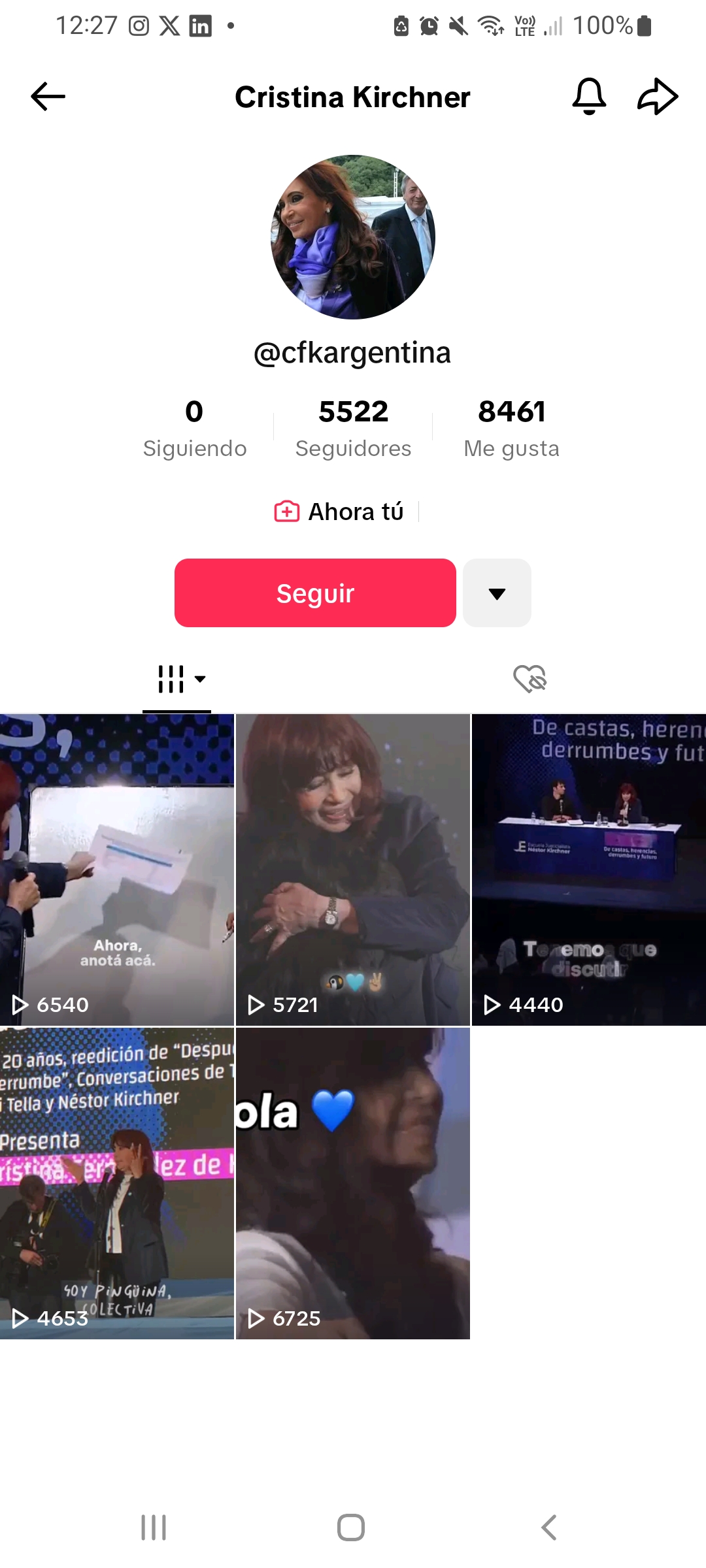 La nueva cuenta, @cfkargentina, publicó cinco videos en menos de una hora. El primero es una compilación de imágenes de archivo donde Cristina saluda a sus seguidores y expresa: «No se imaginan las ganas que tenía de volver a verlos».