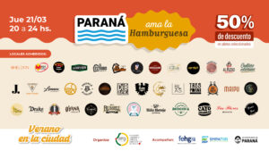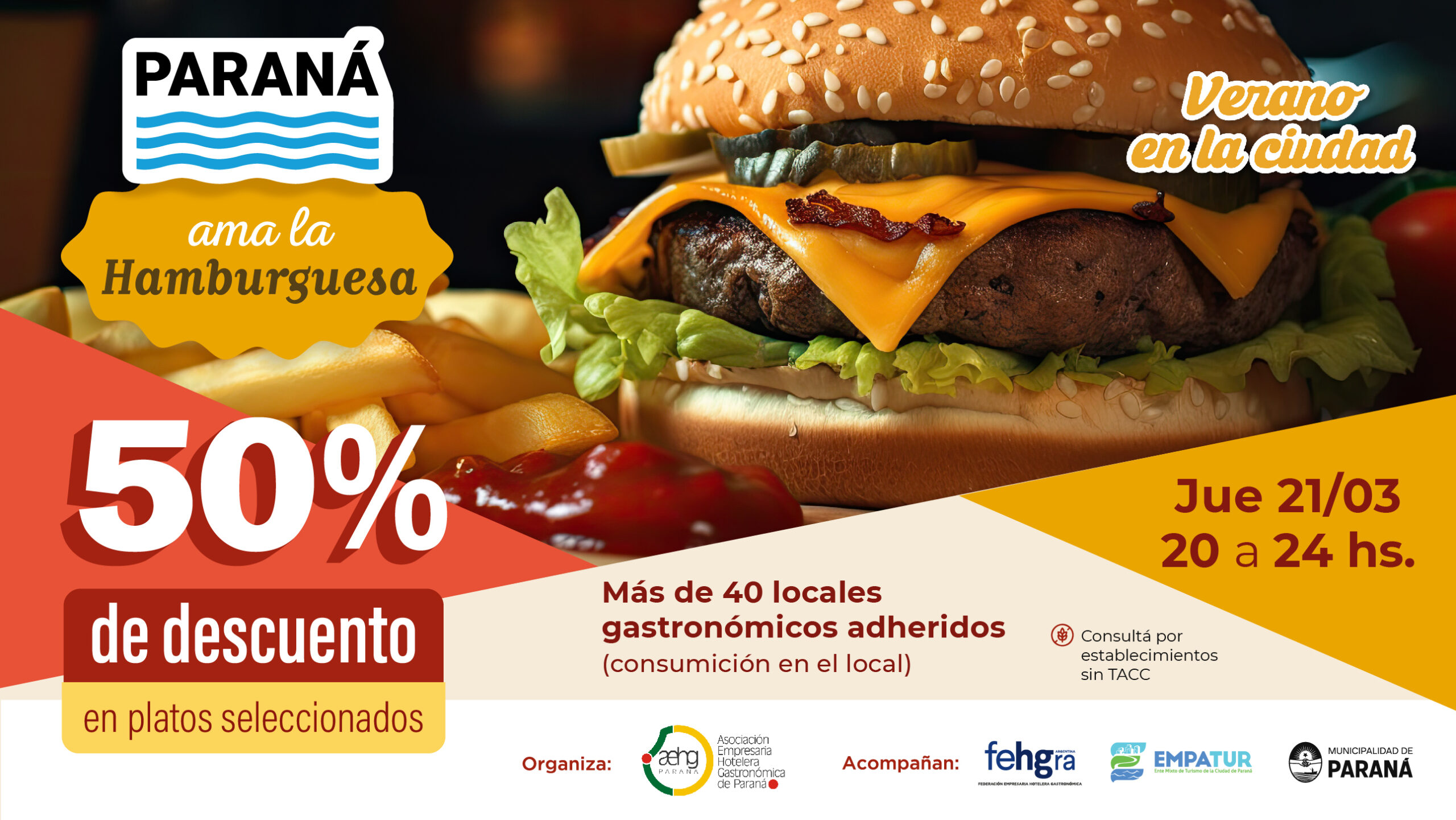 La propuesta “Paraná ama la hamburguesa” será el jueves 21 de marzo, de 20 a 00 hs en locales gastronómicos. Es organizada por la Asociación Empresaria Hotelera Gastronómica de Paraná, y está acompañada por la Municipalidad, el EMPATUR y la Federación Empresaria Hotelera de la República Argentina.