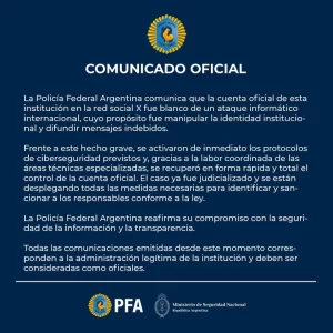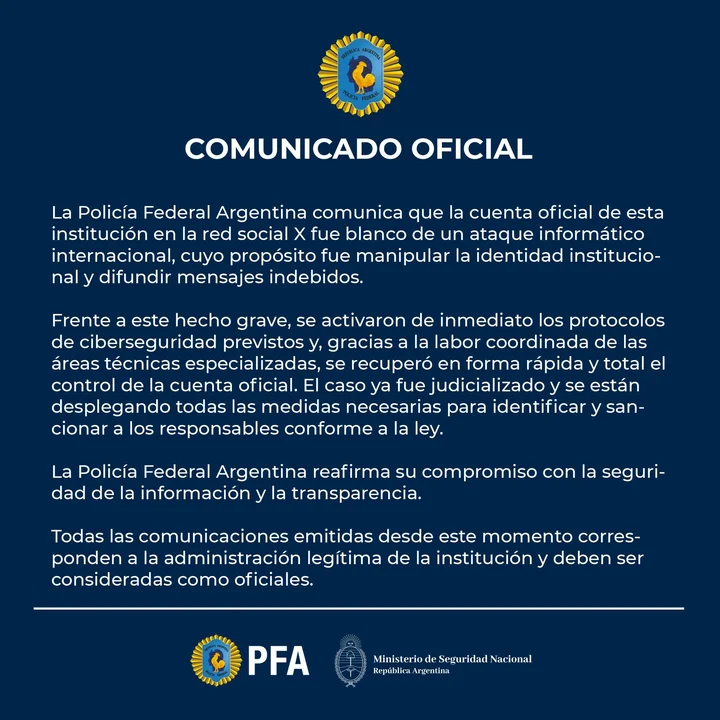 El comunicado de La Policía Federal Argentina comunica que la cuenta oficial de esta institución de la red social X fue blanco de un ataque informático internacional cuyo propósito fue manipular la identidad institucional y difundor mensajes indebidos.