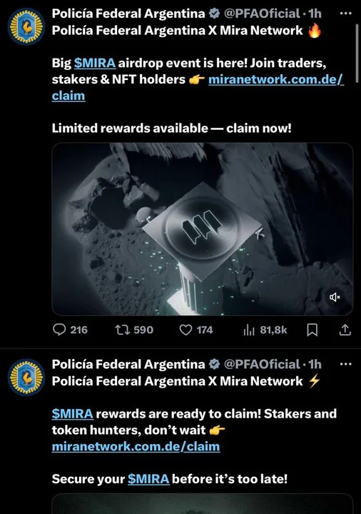 Las publicaciones mencionan: “Policía Federal Argentina Х Mira Network, Big $MIRA airdrop event is here! Join traders, stakers & NFT holders. Limited rewards available — claim now!”. Según se pudo ver se trataba de una criptomoneda con el nombre de $MIRA.