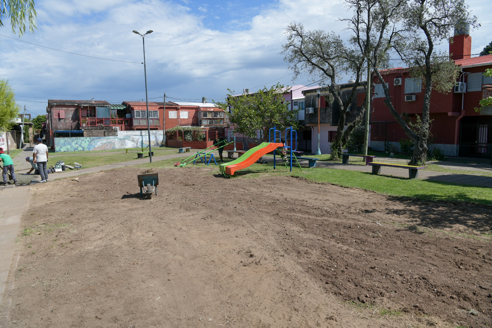 La intervención incluye también el rediseño del acceso principal, donde se instala un cartel identificatorio con el nombre de la plaza, dotando al espacio de una identidad visual clara. Los trabajos se completan con la incorporación de nuevo mobiliario urbano y tareas de parquización integral.