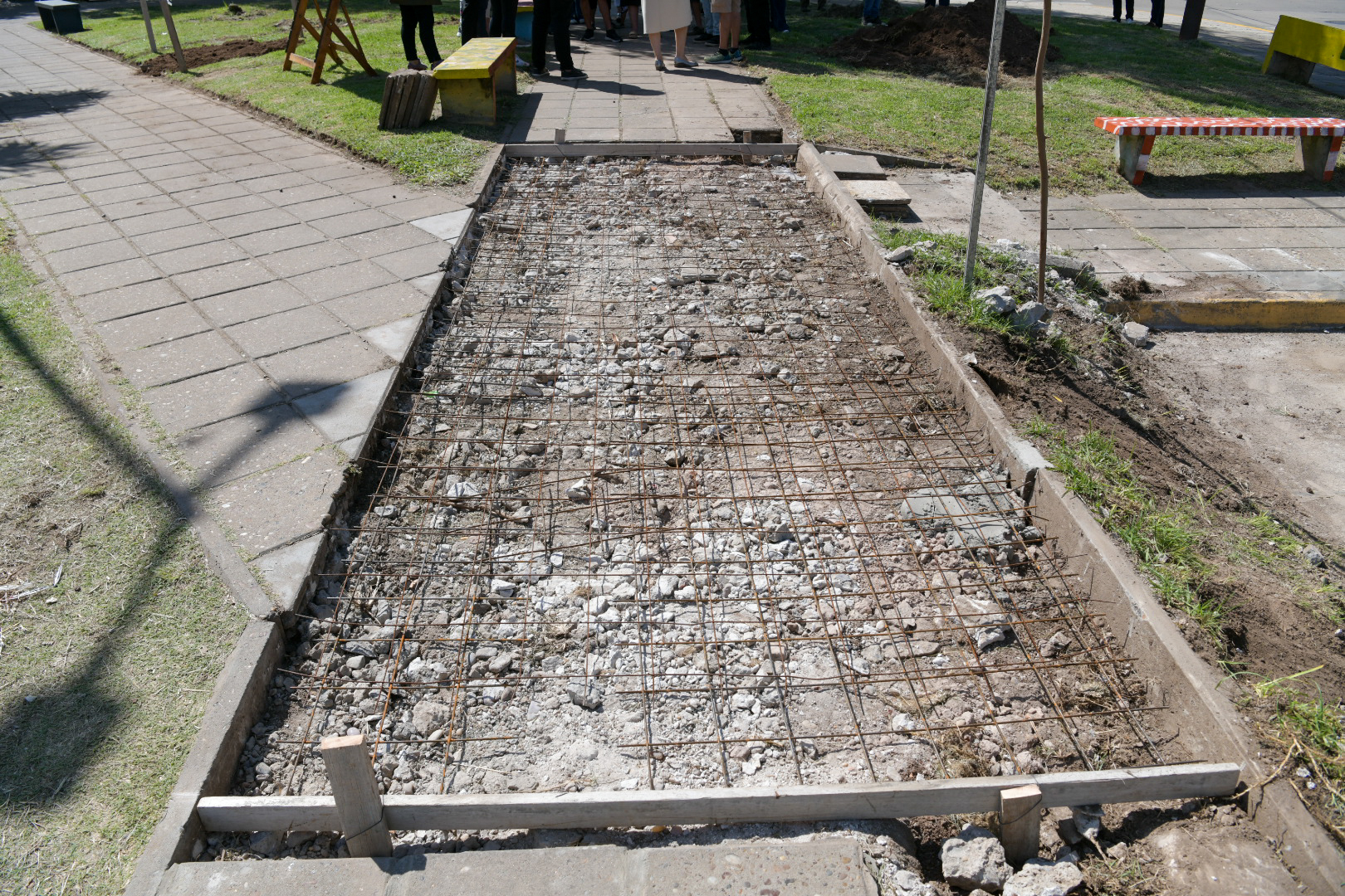 Uno de los ejes centrales de la obra es la recuperación de las veredas interiores de losetas. En lugar de una demolición total, el equipo técnico optó por conservar los sectores que se encontraban en buen estado y reemplazó las áreas críticas de la vereda perimetral con hormigón de alta resistencia, optimizando recursos y garantizando mayor durabilidad.