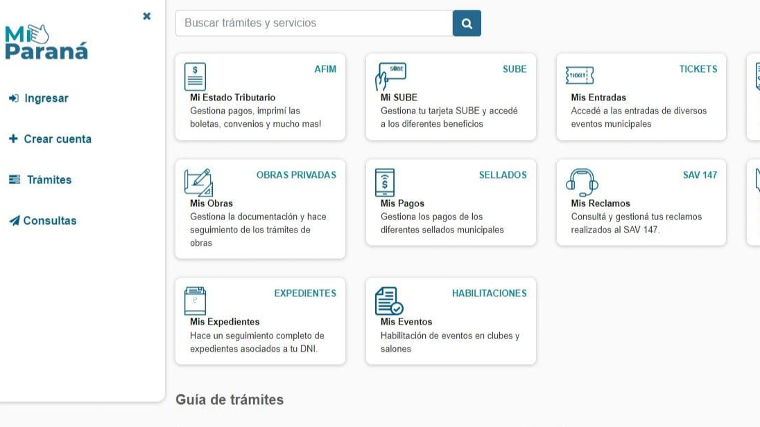 En Mi Paraná actualmente hay diez servicios que se pueden hacer: Mi estado tributario, para la gestión de pagos, impresión de boletas, convenios de pagos y estado tributario de las tasas municipales; Mi sube para gestionar la tarjeta colectivo para estudiantes universitarios; Mis entradas, para acceder a entradas de diversos eventos y espacios municipales como campings; Mis infracciones, donde se observa el Estado de deuda, pago y seguimiento de multas; Mis obras, donde se gestiona documentación y se hace seguimiento de los trámites de obras privadas particlaes; Mis Pagos, gestionan los pagos de diferentes sellados municipales; Mis reclamos, para gestionar reclamos realizados al SVA 147; Mis turnos, para solicitar turnos para trámites presenciales; Mis expedientes, para seguir expedientes de manera detallada; y Mis eventos, para habilitación de eventos en clubes y salones”.