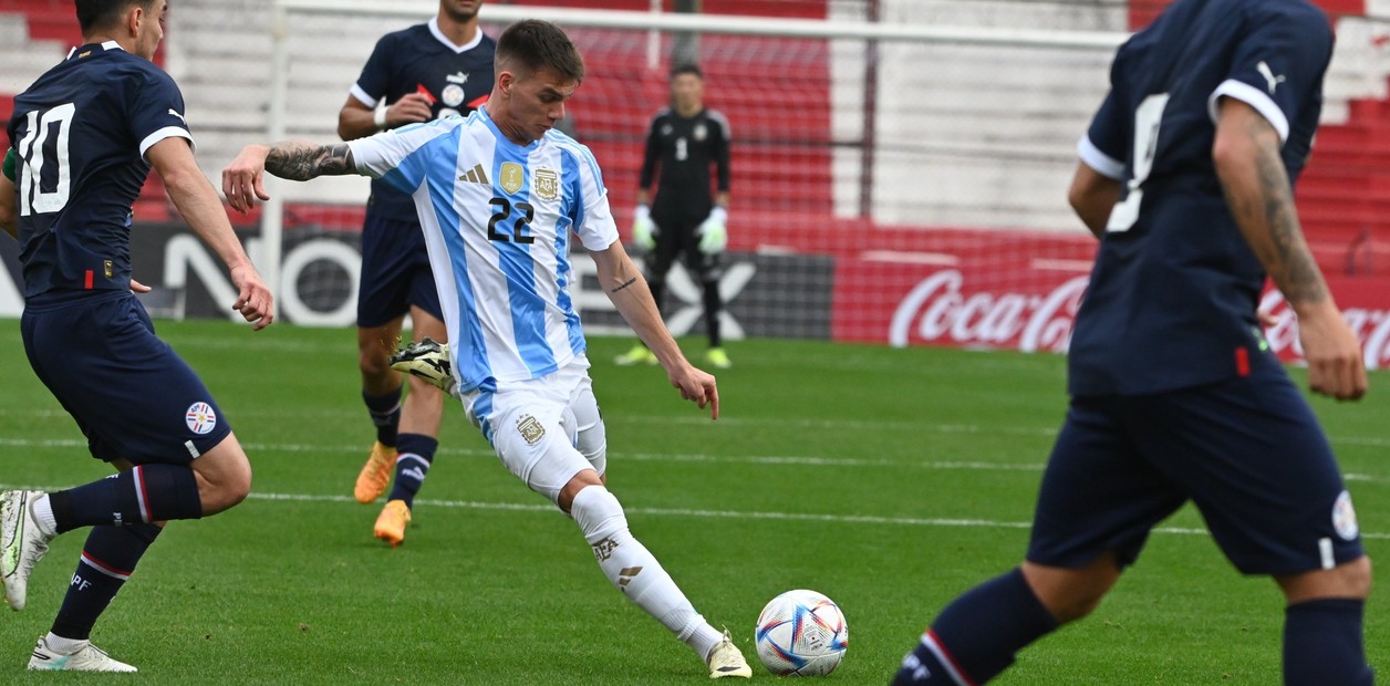 Apenas una jugada había tenido Argentina en los primeros 15 minutos. Dominaba la pelota desde el arranque del amistoso ante Paraguay, pero no lograba llegar al área con peligro salvo por una escapada del Diablito Echeverri. Hasta que, desde afuera del área, Kevin Zenón recibió la pelota y sacó un bombazo que se clavó en el ángulo y abrió el partido.