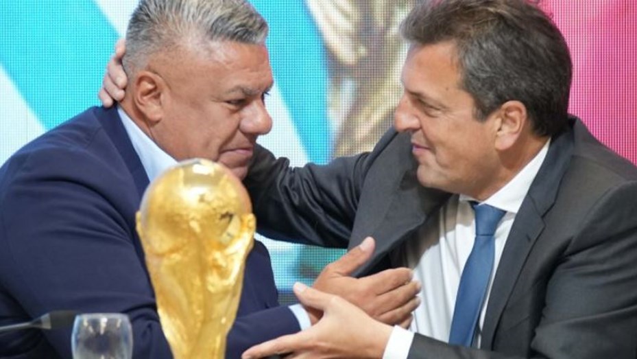 El ministro de economía y candidato a presidente Sergio Massa de Unión por la Patria, presentó junto al titular de la Asociación del Fútbol Argentino (AFA), Claudio Tapia la sede itinerante de Argentina para el Mundial Centenario 2030.