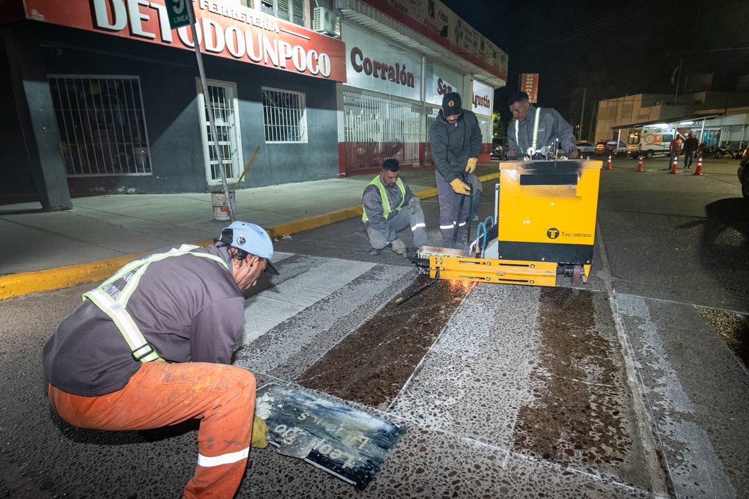 Este jueves de noche, personal de la Secretaría de Servicios Públicos concretó tareas de demarcación horizontal de sendas peatonales, el pintado de cordones en amarillo para designar espacios donde se prohíbe estacionar, arreglo de nomencladores, pintado de paradas de ómnibus y líneas de contención vehicular.