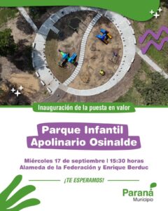 La municipalidad de Paraná inaugurará este miércoles 17 de septiembre a las 15:30hs la puesta en valor de la plaza Apolinario Osinalde