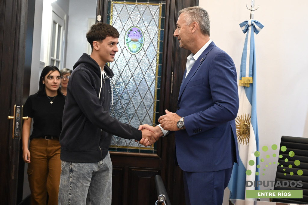 El presidente de la Cámara de Diputados, Gustavo Hein, recibió a una delegación del Instituto Comercial Privado Almafuerte D-70, de la ciudad de Villa Elisa. Durante el encuentro, los alumnos Axel Benítez, Antonela Martínez y Ashley Viollaz, acompañados por las docentes asesoras Evangelina Bracco y Natalia Gorosito, presentaron los alcances de su trabajo titulado «Voces que salvan». La iniciativa, que fue incluida en el programa del Senado Juvenil entrerriano en 2025, propone la declaración de la emergencia sanitaria en salud mental por el término de 12 meses en todo el territorio provincial.