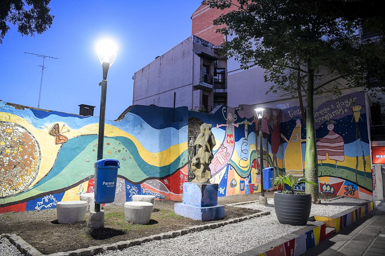 La artística estuvo a cargo del programa Todas las Manos y el taller de mosaiquismo Akasha. Se recupera así un espacio público para el disfrute de los paranaenses. “Celebramos las intervenciones que le ponen belleza a la ciudad”, destacó la intendenta Rosario Romero. La Municipalidad incorporó luminarias LED, papeleros, mobiliario y plantas.