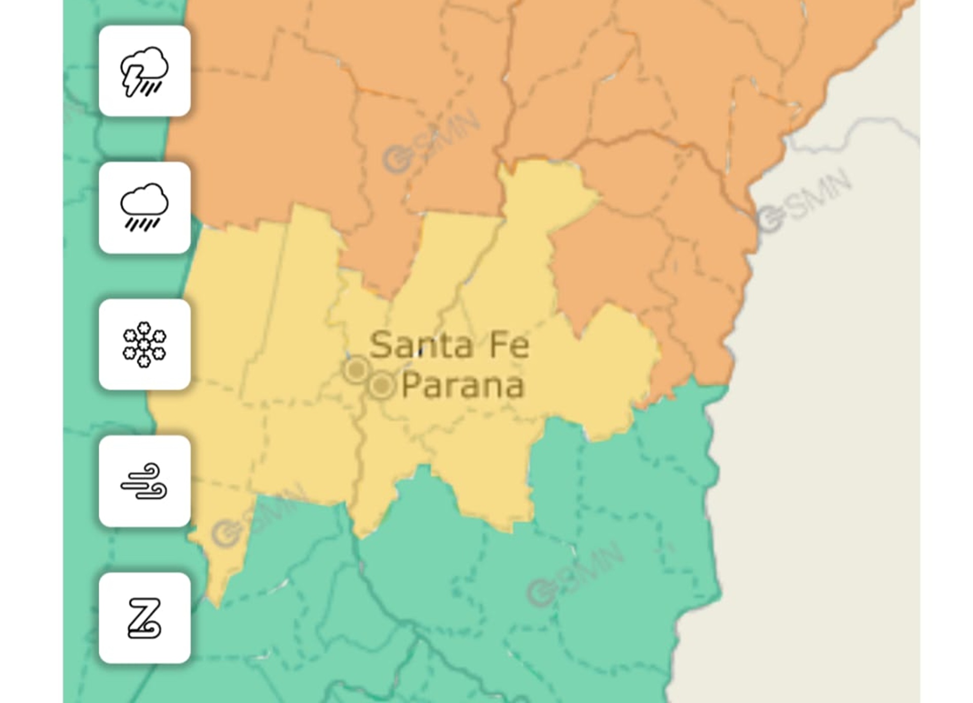 En tanto los departamentos La Paz, Paraná, Villaguay, Diamante y Nogoyá serán afectados por alerta amarillo, se prevén lluvias persistentes y tormentas de variada intensidad, algunas fuertes. Las mismas estarán acompañadas principalmente por precipitaciones abundantes. También pueden incluir ocasionalmente granizo y ráfagas que puntualmente podrían alcanzar los 75 km/h. Se prevén valores de precipitación acumulada entre 50 y 80 milímetros., que pueden ser superados en forma puntual.