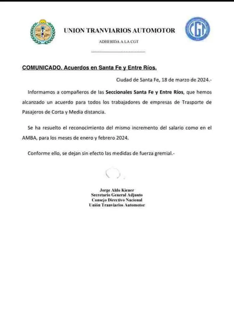 «Se ha resuelto el reconocimiento del mismo incremento del salario como en el AMBA, para los meses de enero y febrero de 2024», indicó UTA en un escueto comunicado.
